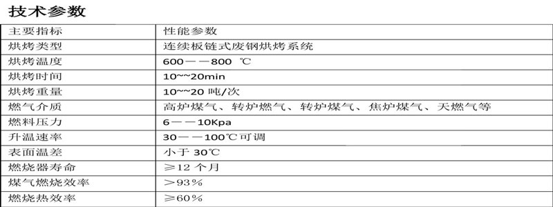 連續(xù)板鏈?zhǔn)綇U鋼加熱爐采用板鏈輸送方式,上氣、方采用∪型槽保溫蓋結(jié)構(gòu)的烘烤方式,通過(guò)板鏈輸送廢鋼,廢鋼加熱段和廢鋼預(yù)熱段上方有∪型槽保溫蓋,保溫蓋固定在板鏈輸送機(jī)兩側(cè)的鋼結(jié)構(gòu)架上。預(yù)熱加熱段、加熱段保溫蓋上方均布有多個(gè)燒嘴,起到對(duì)廢鋼的預(yù)熱和加熱效果,提高廢鋼的溫度。當(dāng)烘烤完成后,由板鏈輸送機(jī)帶動(dòng)廢鋼輸送到端頭的料斗中。
